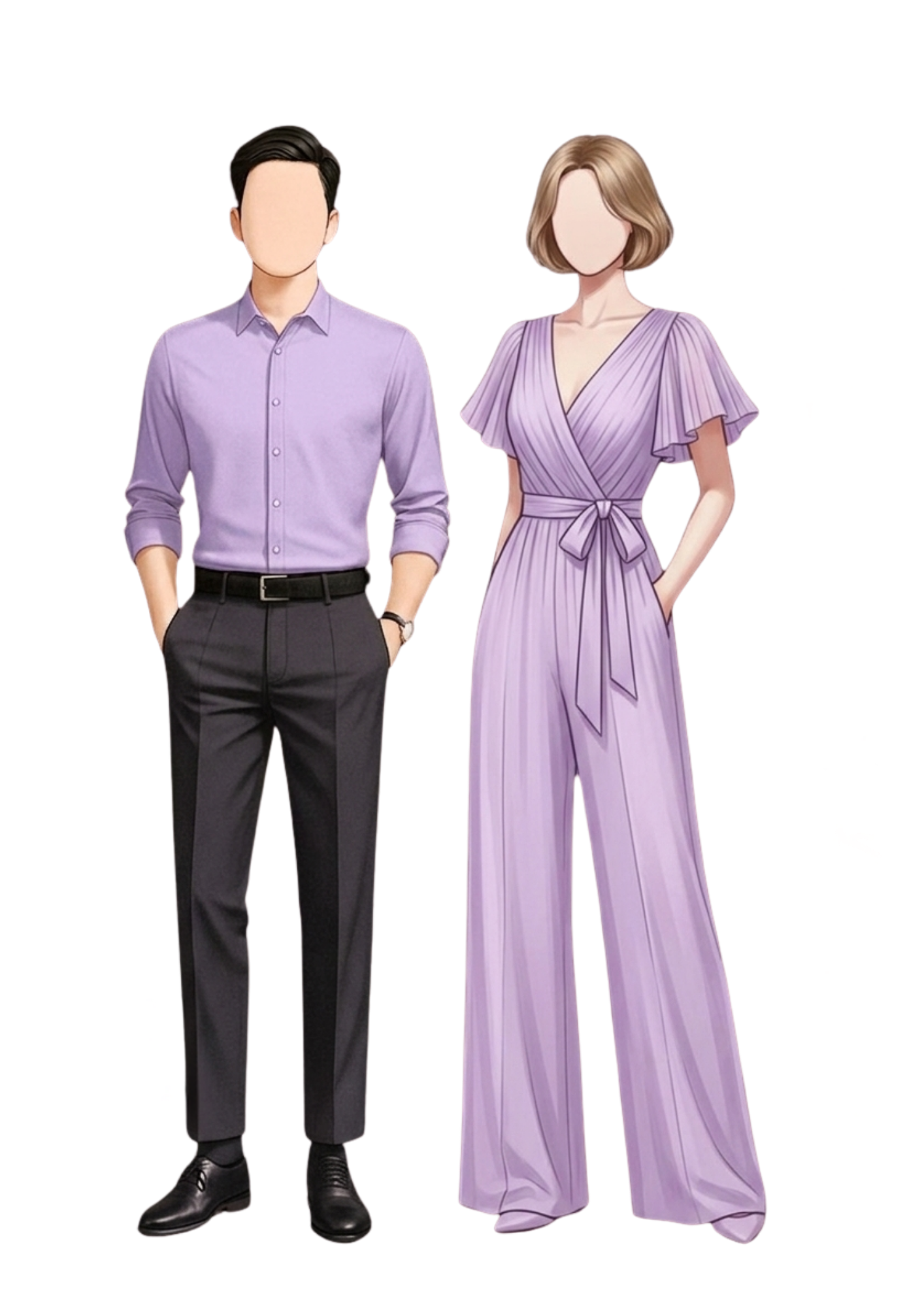 Gentlemen: Light gray suit and pants, white longsleeve and lavender necktie