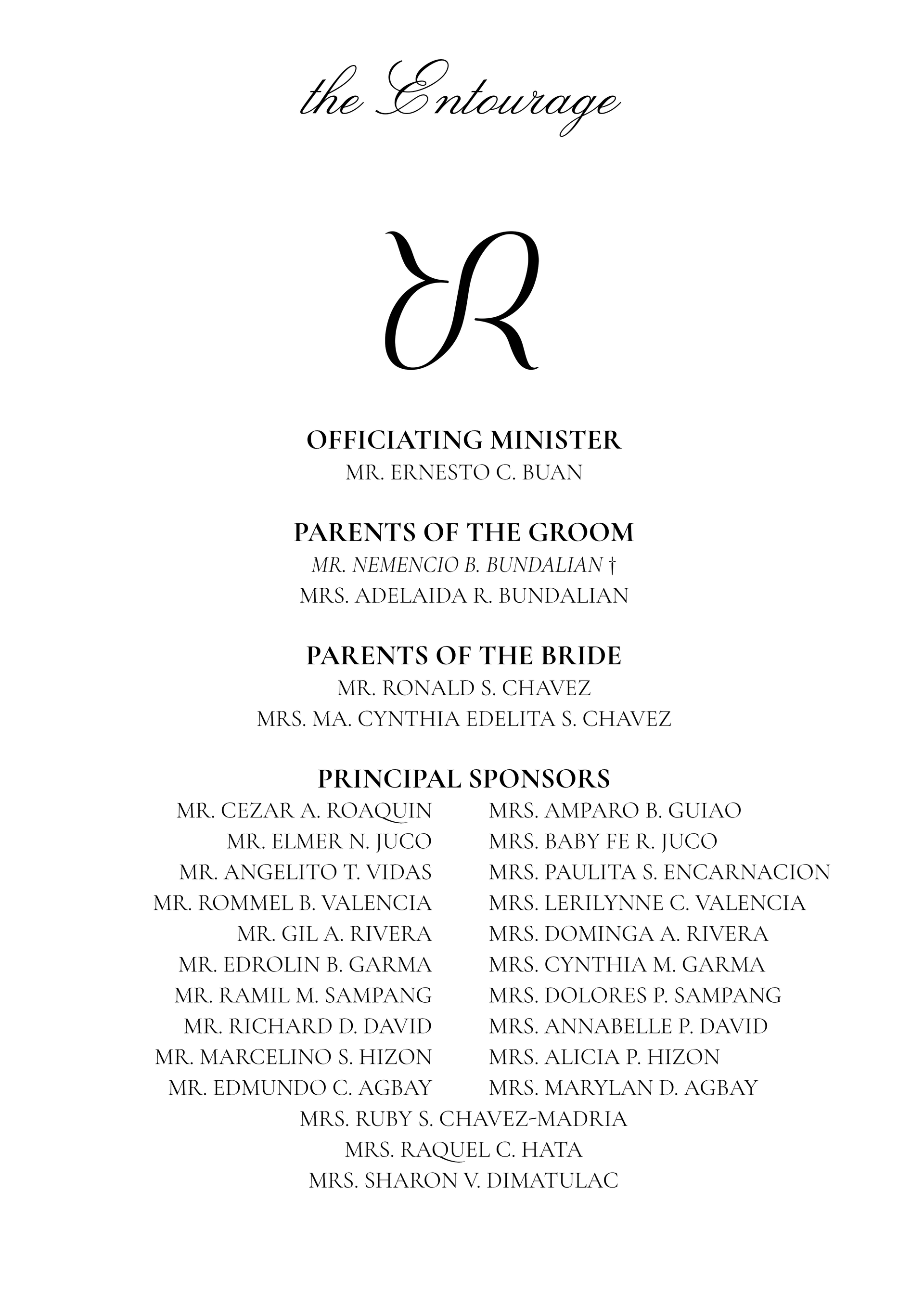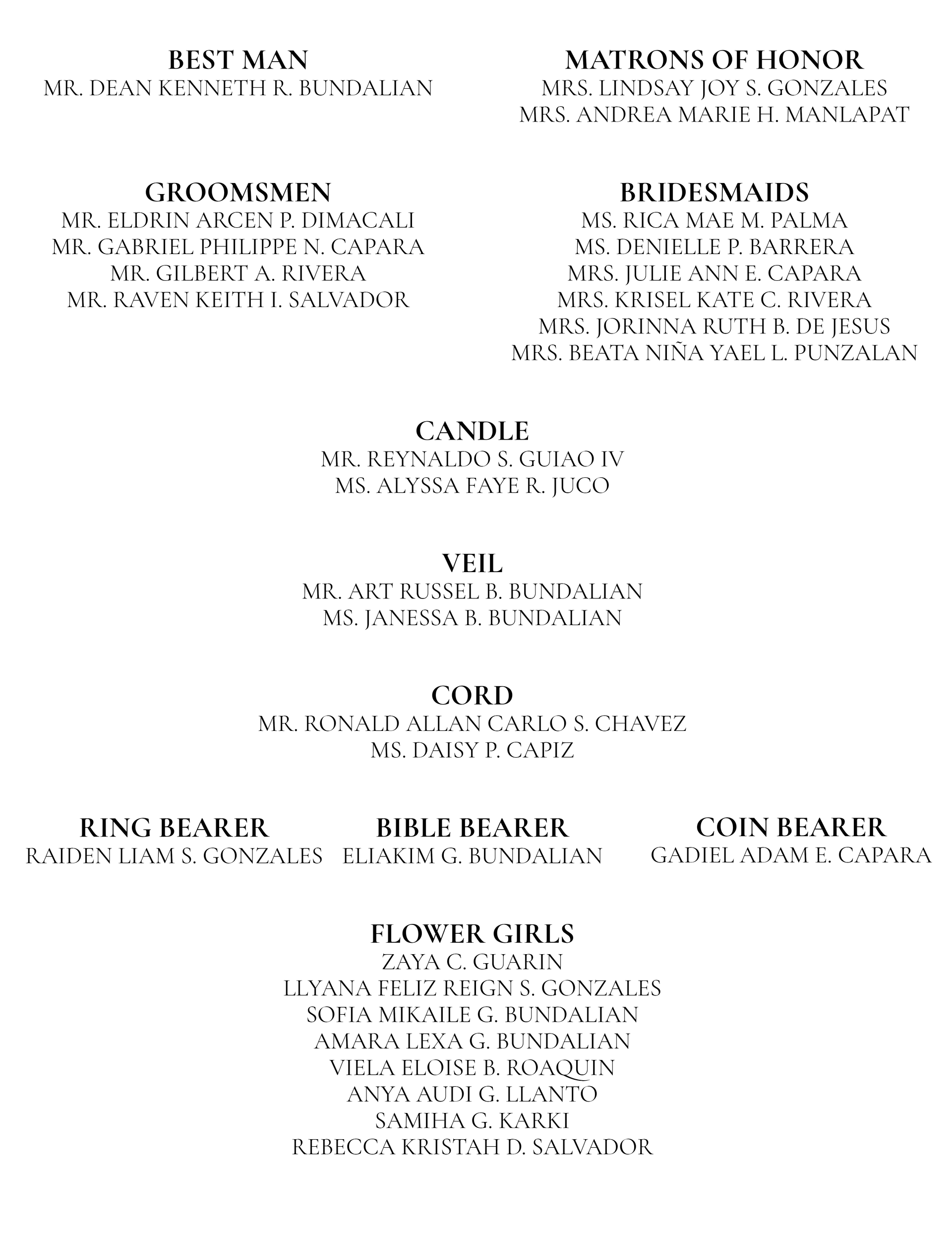 Gentlemen: Black suit and pants, white inner polo shirt (Neckties will be given prior to wedding day)