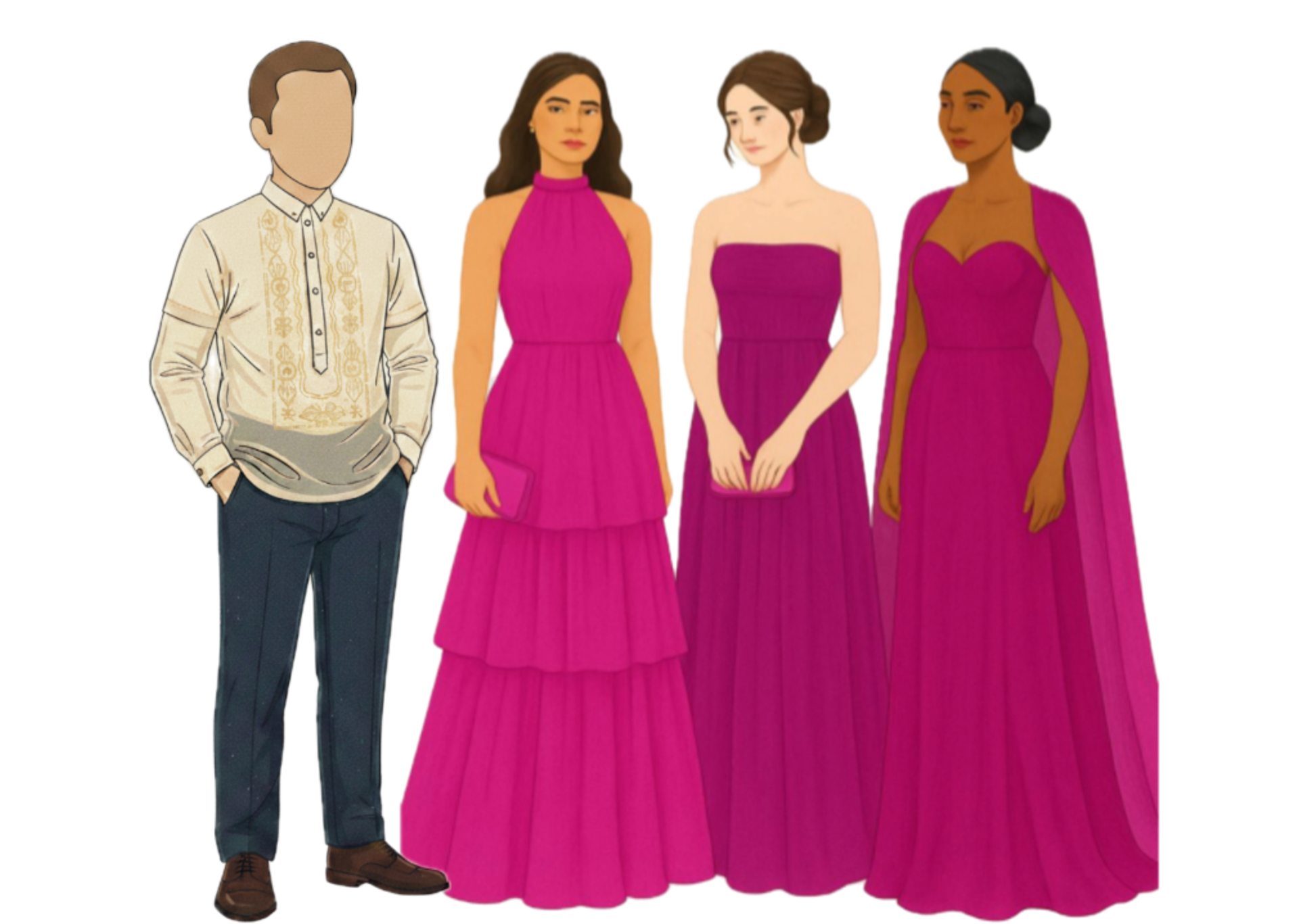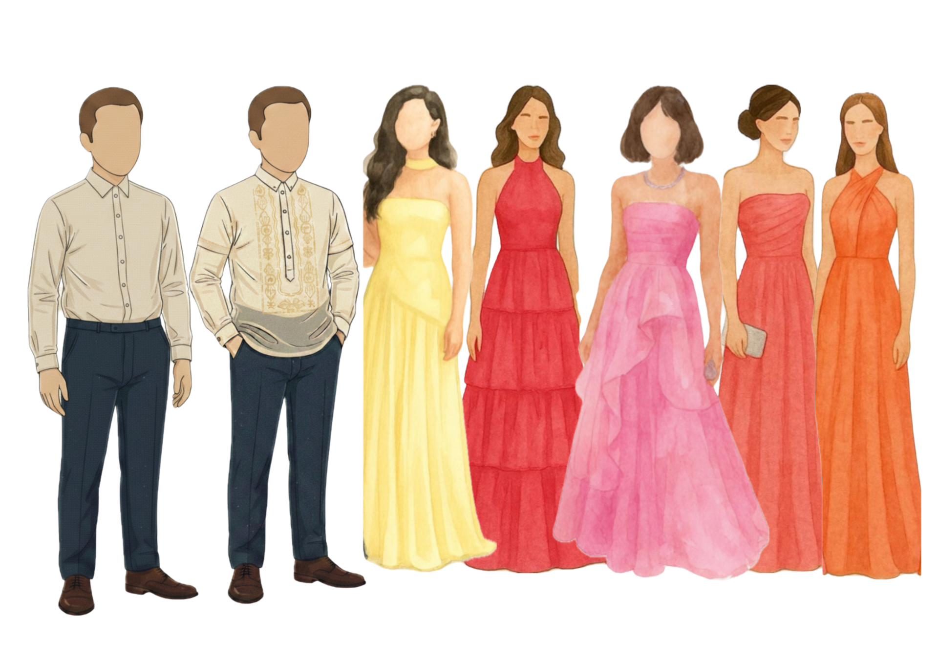 Gentlemen: Barong Tagalog and dark trousers.